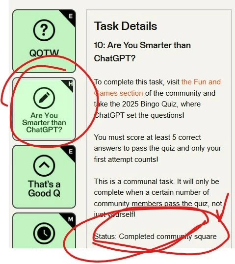 - Earn squares on your Bingo board (red = incomplete, green = complete, blue = community task)