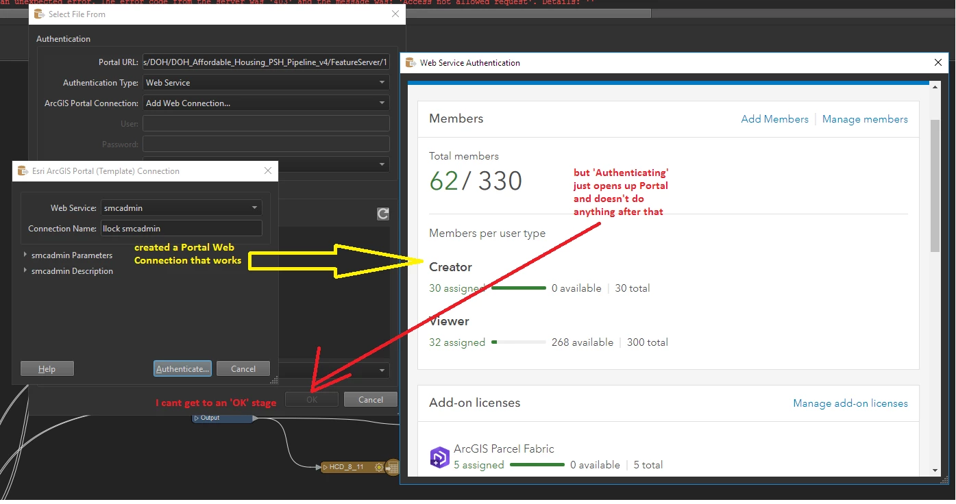 I was able to create a Portal Web Connection from the Template but after I 'Authenticate' nothing happens--the window does not close and I can not proceed to the 'OK' stage and move forward. What is the problem?... this process works fine when creating an ArcGIS Online connection because the Authentication window closes automatically and you can finish the process, but with Portal it just stays open and shows my portal and there is no way to finish the process. Any help would be much appreciated! !