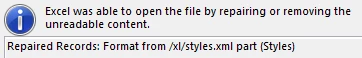 My problem is when I want to write out the excel with the new value then it comes out all wrong, even if I just do an update it still changes the document in a way that all the formulas loose their references and the whole thing becomes unusable. The original file is 5.124KB but the updated one is 4.961KB and gives this warning when opened in Excel:
