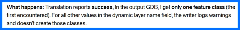 What happens: Translation reports success, In the output GDB, I get only one feature class (the first encountered). For all other values in the dynamic layer name field, the writer logs warnings and doesn’t create those classes.