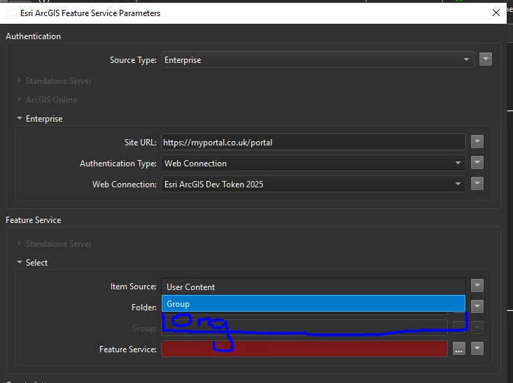 Within the new ArcGIS Feature Service reader (part of the Esri ArcGIS Connector Package) if you choose a source type of Enterprise it’s not possible to connect to a feature service that is shared across an entire organisation and not in a group.