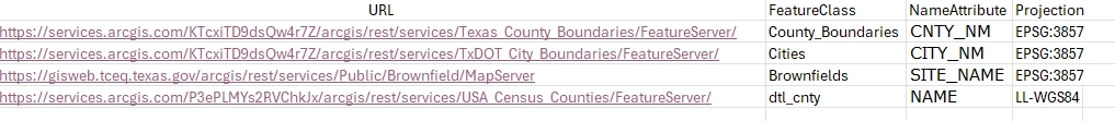 I have a csv spreadsheet of arcgis server feaureservice urls with the featureclass, name attribute , and projection attribute. This list is long and has multiple servers and I want to pass this list into my workspace and have the FeatureReader transformer read the url and featureservice with a spatial filter for my area of interest (AOI) and then clip out the data I need inside the AOI and only keep the attribute name field in the result, run some additional analysis, then write out the clipped results to a GDB, then move to the next record url in the spreadsheet.. My plan is to reproject the AOI to each projection listed in the csv and then pass the AOI as the creator to the FeatureReader transformer to only read based on the spatial filter. This works great if I do separate feature readers for each URL but that makes for a gigantic workspace and isn’t very dynamic as the spreadsheet and AOI changes frequently. Is there a way to pass a csv list to the FeatureReader in this way and accomplish this with multiple dataset schemas?