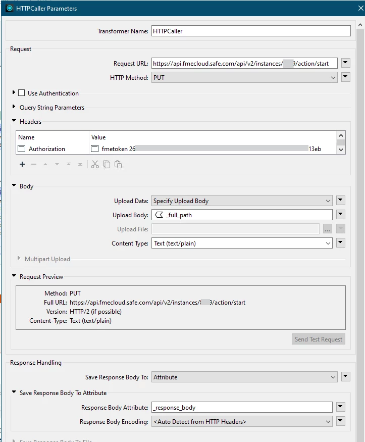 I need some help configuring this transformer please. This is how I have it set up, the Request URL features the api.fmecloud link, I have added the 4 digits for my instance but they are greyed-out in the screen shot.
