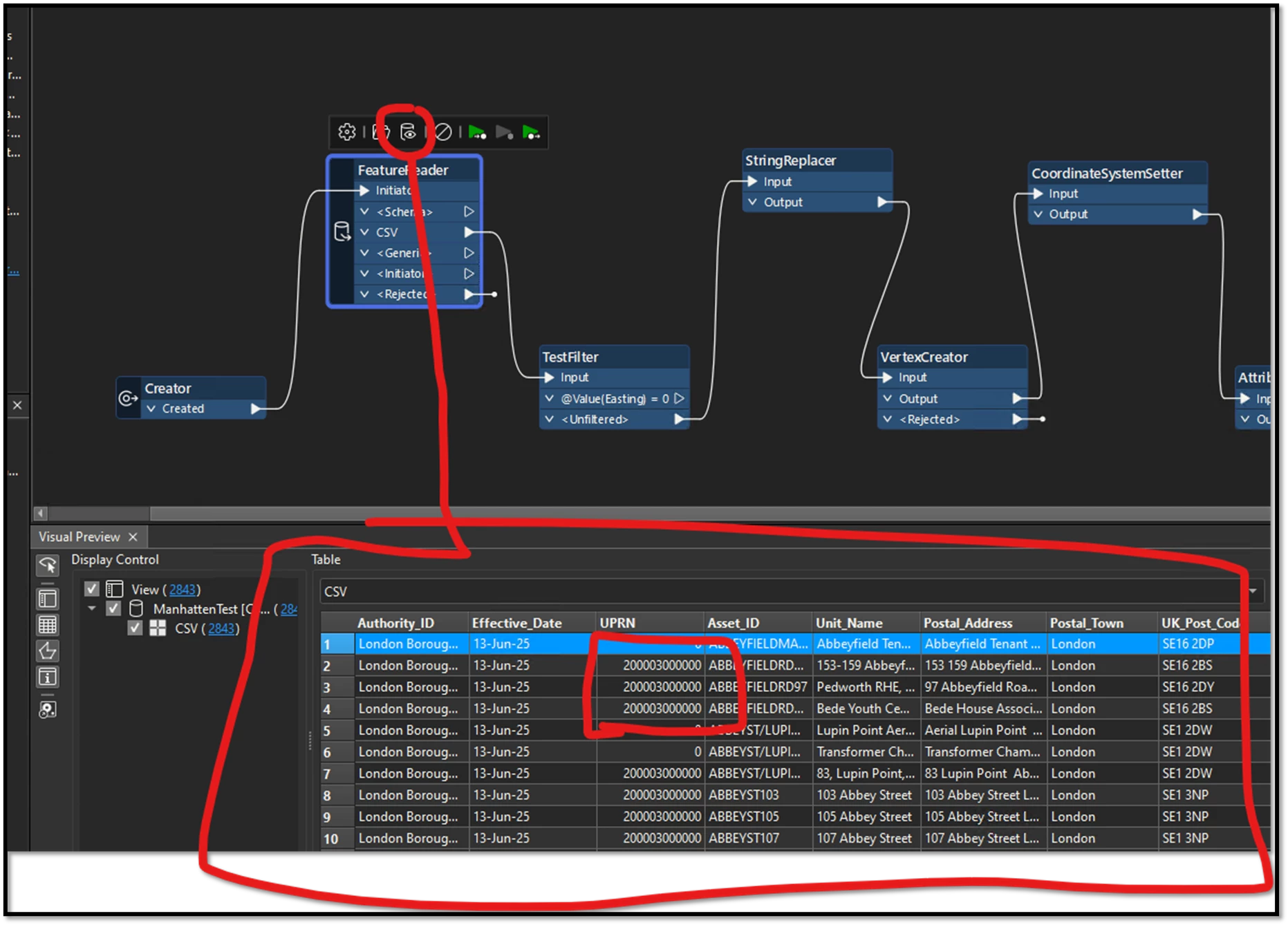 I have a workspace which is reading in a csv containing a field called UPRN. Some of the values are full (e.g.: 200003362891) but some values are zero. This is expected in the data and is fine.