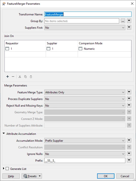 Nothing specific is used for the merge, and any merged attributes are removed based on the prefix.
