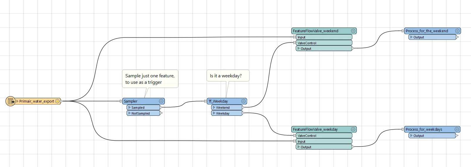 And the FeatureFlowValve is exactly what I was looking for! The only objection I have is that it seems to be a transformer from the 32-bit era, so a bit outdated. In the example provided by @redgeographics, my question is how to use the output of the testfilter as a trigger for starting a subprocess within the workspace (or not).