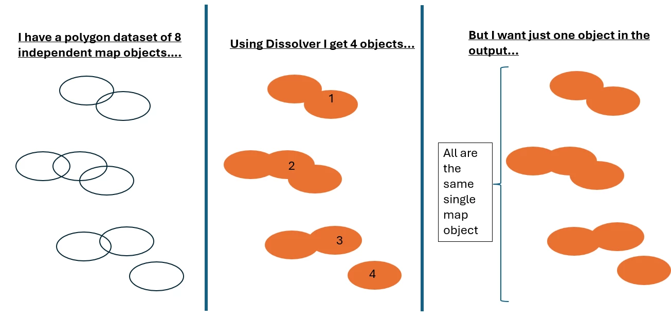 I want to merge all of the polygons, whilst dissolving any overlaps, to create just one polygon object. Using Dissolver I am only able to merge polygons where they are overlapping, whilst input polygons that are not overlapped by other are remaining unmerged. This means that I’m getting 80,090 records in the output. But I don’t want that. I want just one polygon object as one record.