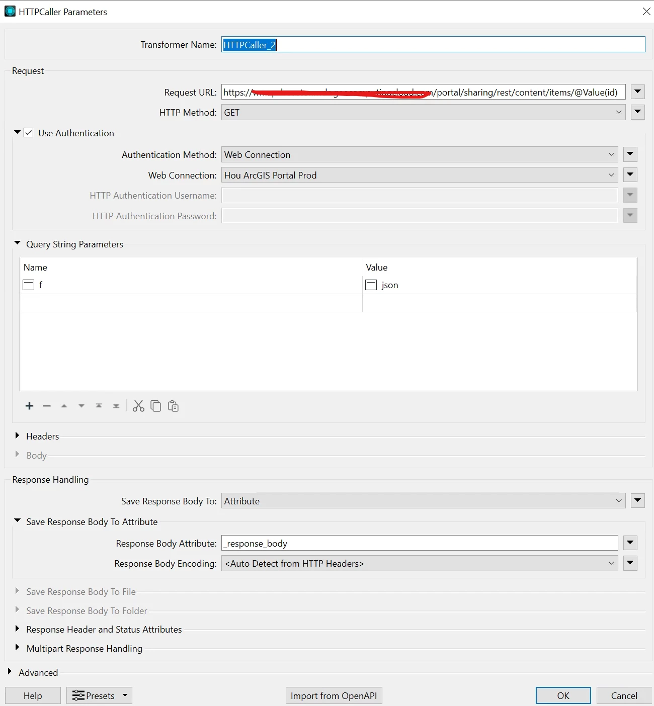 We are at FME 2024.2, both Form and Flow. I set up an organizational webhook in ArcGIS Enterprise Portal (11.3) to respond to the item sharing action and use a workspace to process the content message. The workspace extracts the item id and then use the HTTPCaller to retrieve the item’s metadata, using this URL parameter -- https://myArcGISURL/portal/sharing/rest/content/items/@Value(id), Testing of the webhook content message in the FME Form is successful. But when running this workspace on the FME Flow webhook automation, the HTTPCaller gives this error. It appends a token parameter to the URL parameter.