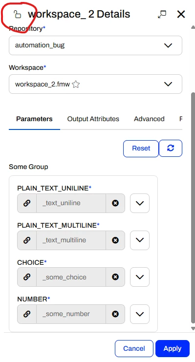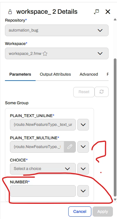 I’ve also seen that if I click the padlock button to lock the parameters then the number type parameter disappears and (a clue) is that the value changes from “_text_uniline” to the actual key e..g, {route.NewFeautreType._text_uniline}