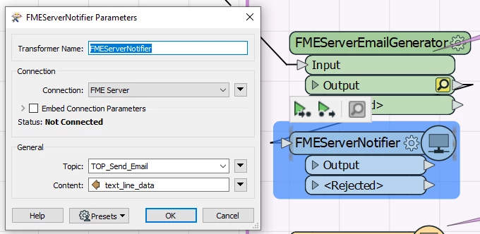 My existing workflow is FMEServerEmailGenerator -> FMEServerNotifier ->