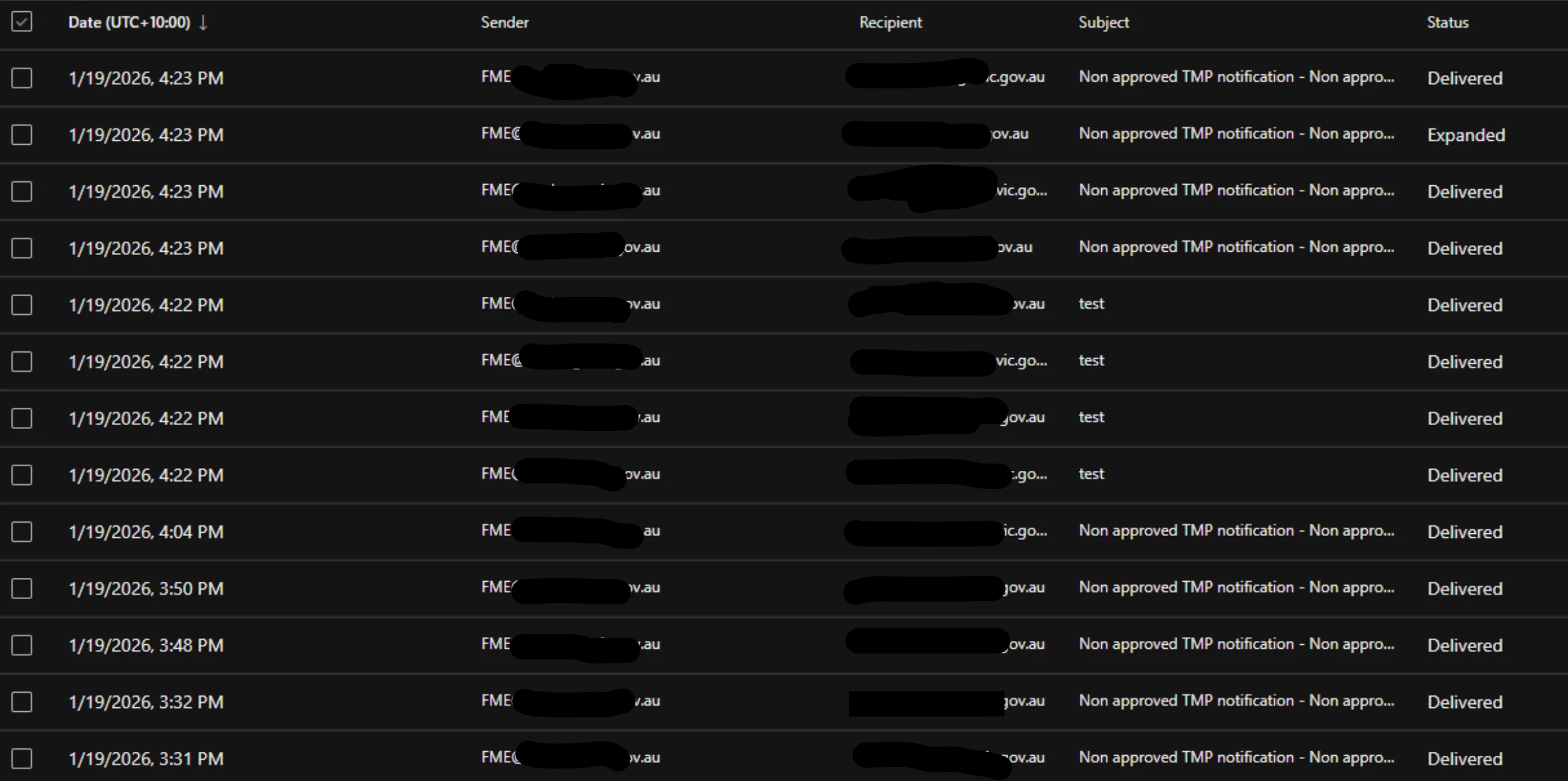 Mon-19-Jan-2026 03:35:56.273 pm | INFORM | pool-2-thread-61 | Non approved TMP notification (e97e7a37-d7f6-4452-86b6-0c71e2a1decc) | event (640991ed-84e5-46b3-939f-cac134976325) | 801007 : Sending email with subject "Non approved TMP notification - Non approved TMP notification" to recipient(s) "xx@xxx.gov.au" ...