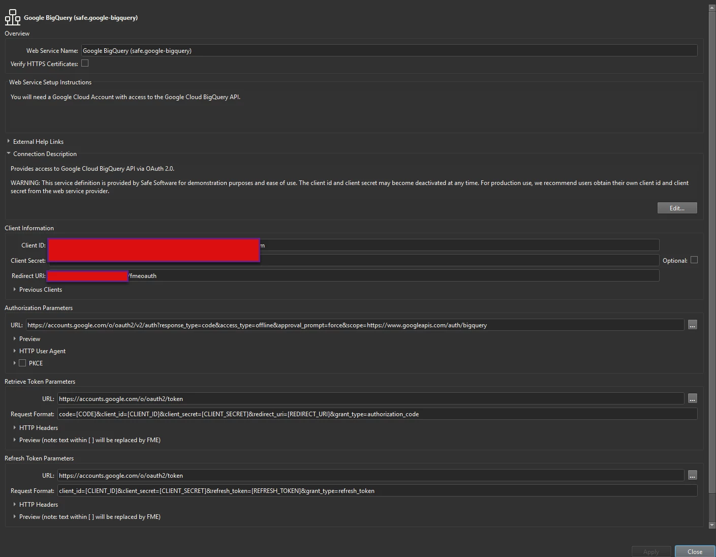 We setup an OAuth client in GCP that we’re trying to get working with FME Flow. I have installed the safe.google-bigquery package on FME Form and configured the web service with our unique client information from GCP. See below