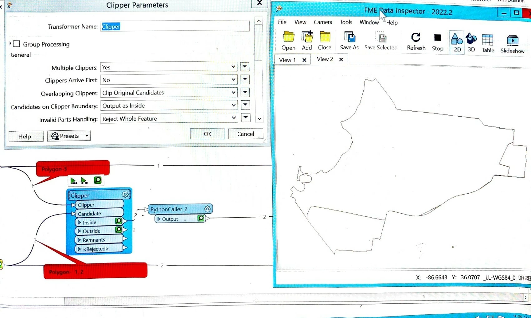 Send polygon 3 to the ‘Clipper’ port of a Clipper transformer, and send polygons 1 and 2 (or just polygon 2 - use a Tester if needed) to the ‘Clippee’ port then keep the ‘Inside’ part of the result in the Clipper transformer’s output.