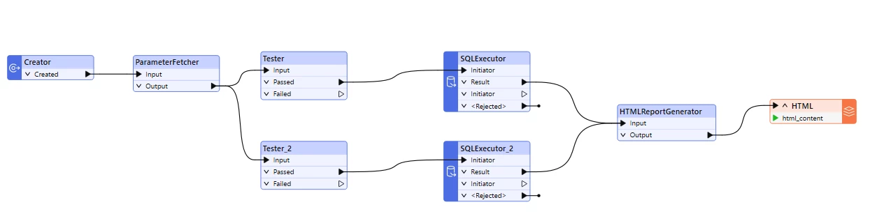 The screenshot below shows the simple flow - the users parameter values are tested to see which are blank/missing for when optional fields have no selections entered/chosen. The appropriate SQLExecutor then outputs the matches to the HTMLReportGenerator which creates a HTML table for the writer to generate the content.