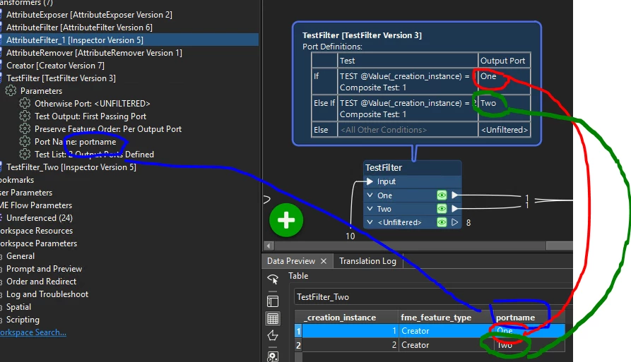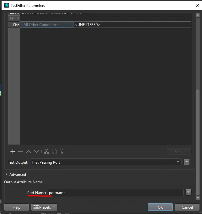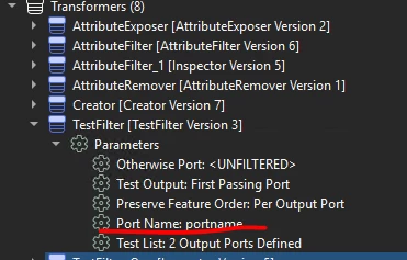 I know it is possible to do it by hand, place a AttributeCreater behind every port and fill in the Output Port name. But I have a large number of TestFilters, and to avoid errors and keep things organized, I would like to do it automatically with one AttributeCreator/AttributeManager.