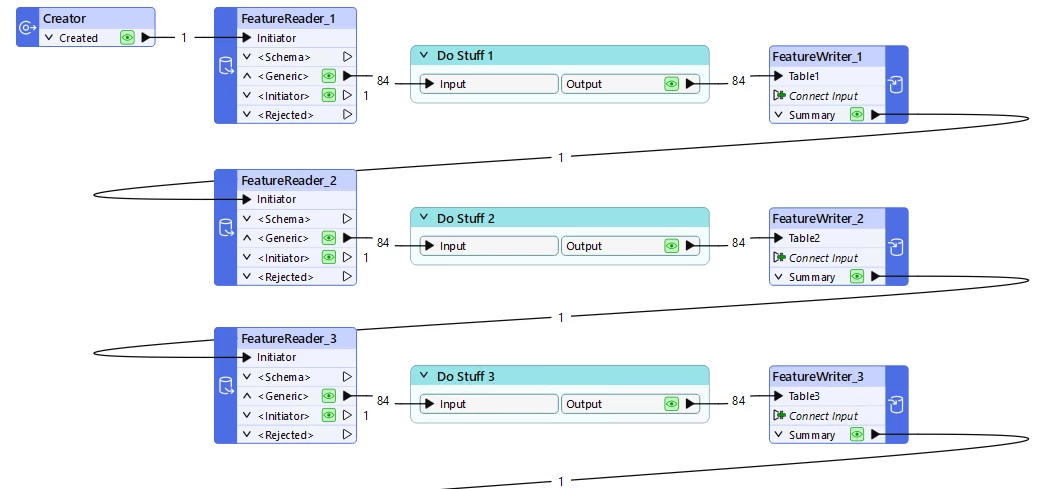 I created an FME script in which I have 10 Readers and 10 Writers. I would like to run this script in a specific order. I don’t want FME to execute everything in parallel, but instead wait for Writer A to finish before reading Reader B… How is it possible to run things sequentially?