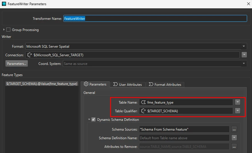 I’m struggling with dynamic worflow when i want to change the target MS SQL DB schema (table qualifier). When i want to migrate data between databases with the same DB schema, it’s fine. But when i want to change the schema i’m running into errors. So far I could manage to migrate data from custom schema (e.g. “ldm”) to default “dbo” schema manipulating “fme_feature_type” and fme_feature_type_name” (also not sure about the differnce of these 2 attributes) in Attribute Manager assigning just Table name and omitting the schema qualifier.