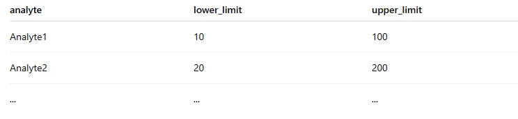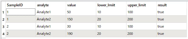 I have two tables where I have to compare rows against columns. First table (excel) contain Analytes as columns, but the second table (sql) has analyte column which contains all the analytes as values. I have to compare the values from the Excel table (which has analytes as columns) with the corresponding limits from second table.