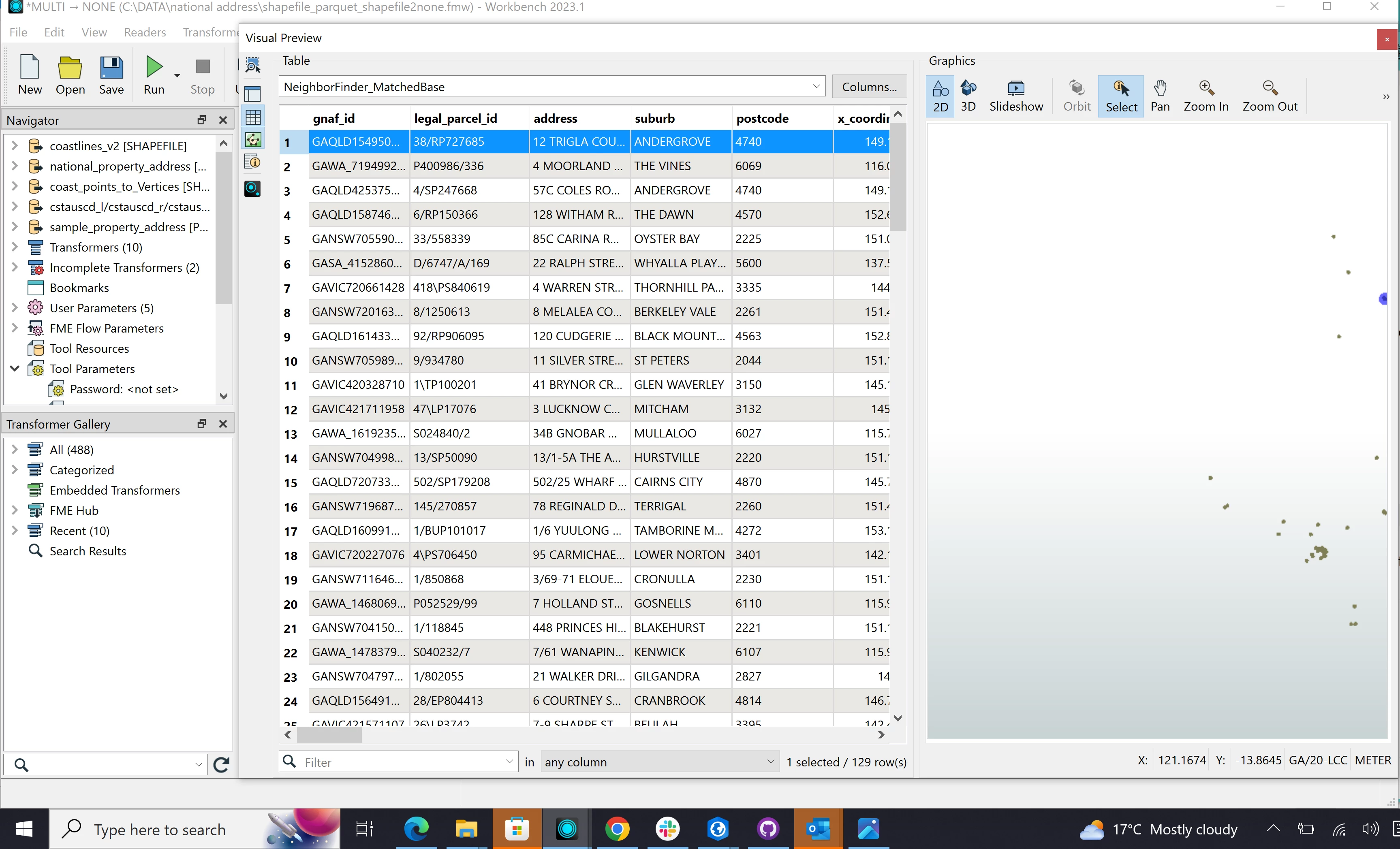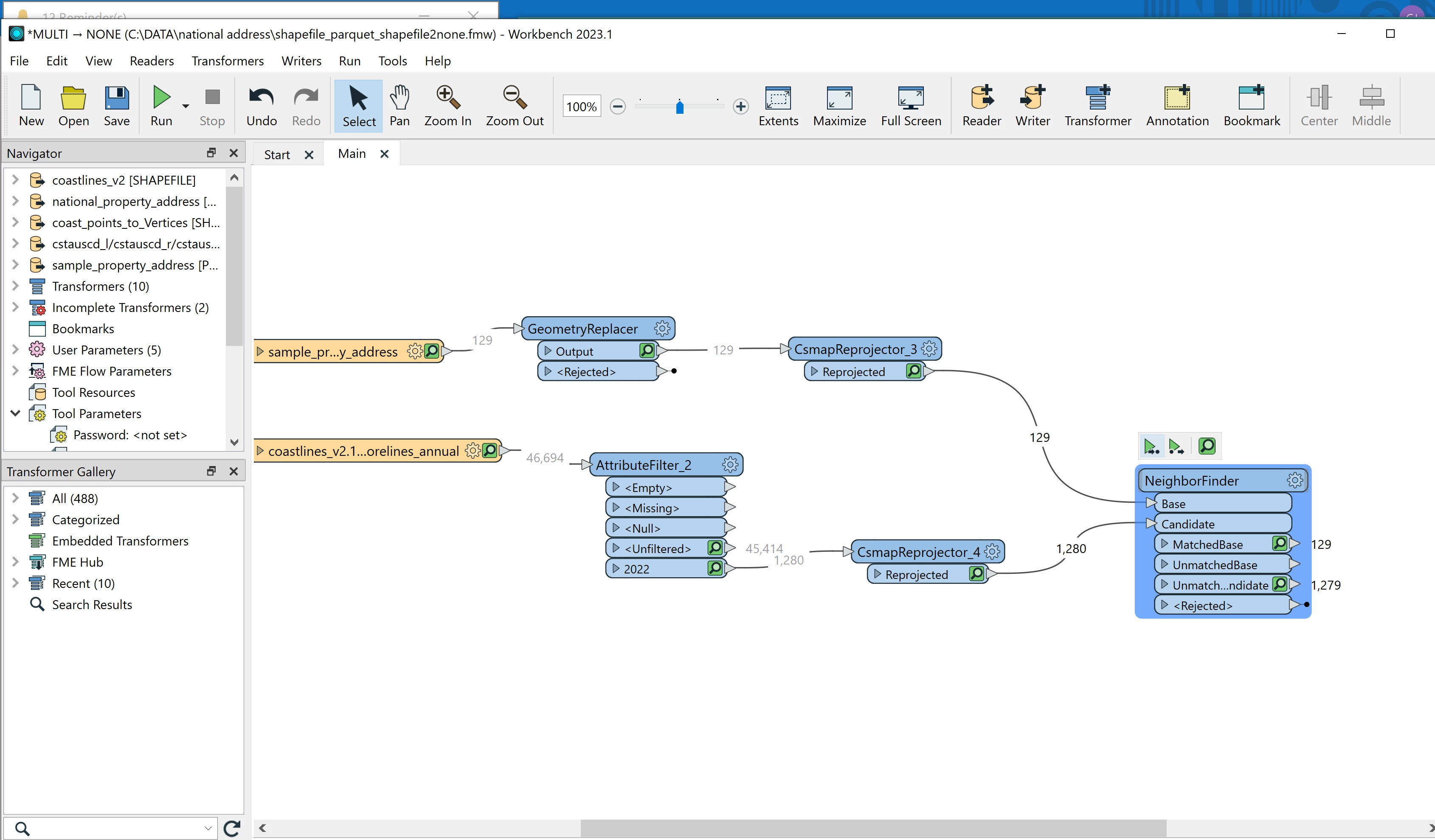 Hi All I have a point distance data set in a parquet file with x y coordinates and a geom column with geometry encoded in hex binary and i have line data for coastline I want to calculate distance between these points and the coast polyline .In my workflow am using geometryreplacer to get the geometry then projecting both layers using csmapProjector then using neighborfinder but am getting unexpected results ...is there a better approach