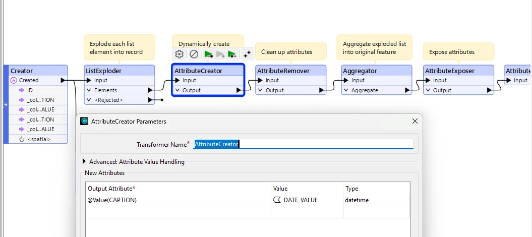 The list exploding only brings out the name of the original column ‘caption’ but I am looking to use the values in the list itself to build the attributes and populate the values.