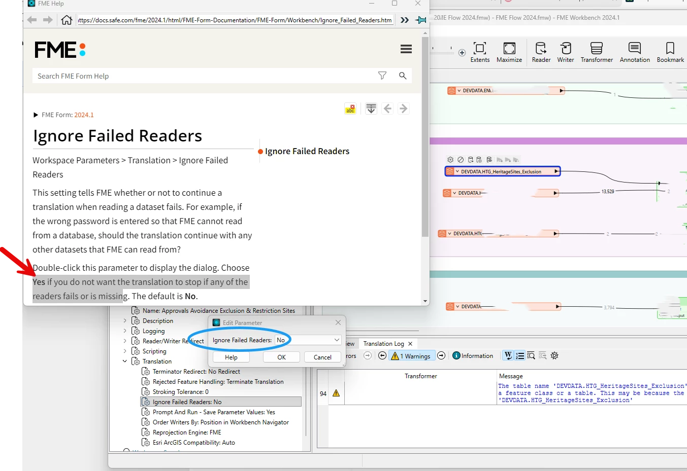 Unsure how the Reader parameter “Ignore Failed Readers” truly works. It seems designed very early on to Error if the dataset/database fails to connect. Fine for single datasets, but perhaps unwhelming for workspaces with dataset/databases with many FeatureType. In this issue/case, only one featuretype is missing from the geodatabase, so a warning is thrown. Warnings are often missed in comparison to error and termination.