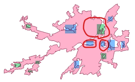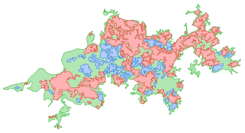 Source PolygonAreas to Fill - blue: real holes, red: pseudo holes (7,000+ m2)Result after Filling