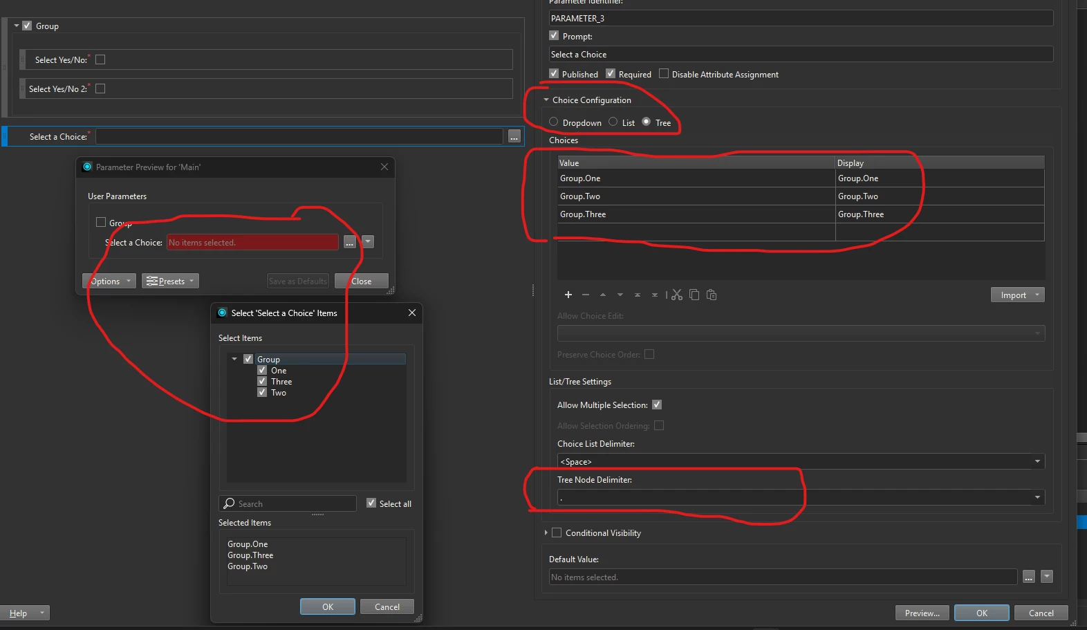 Please see my konfiguration for the group box parameter and the yes/no parameters inside Group Box.
