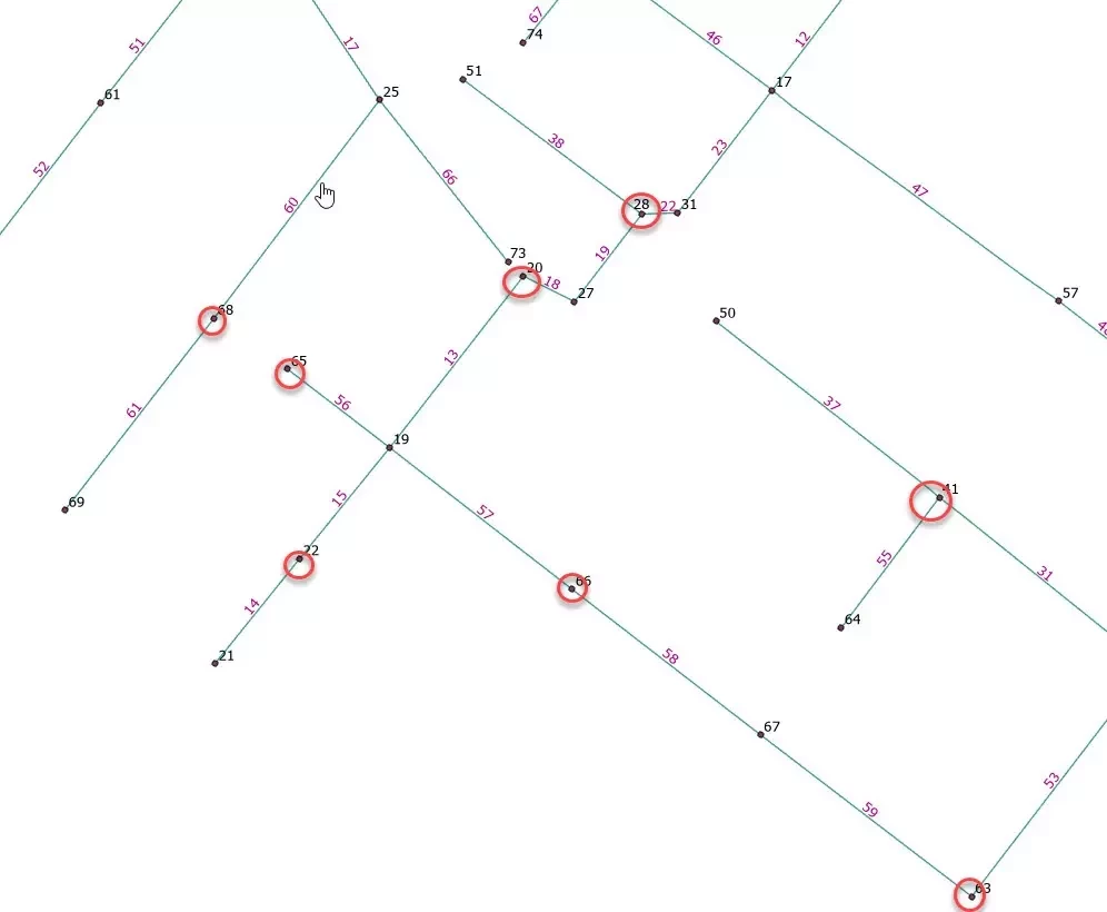 Below is a screen capture - I want to eliminate points in between, those circled in red below in this example. Is there a way to somehow bypass these in my selection set i.e. select 21, skip 22, select 19 etc. I want to be able to do this for a network of 10K+ lines/points.