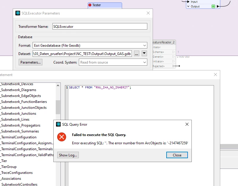 I'm working on a workflow using FME where I want to use the SQLExecutor transformer to query data from a File Geodatabase I've set the input to point directly to the FGDB file, and tried several SQL queries — even very simple ones like: