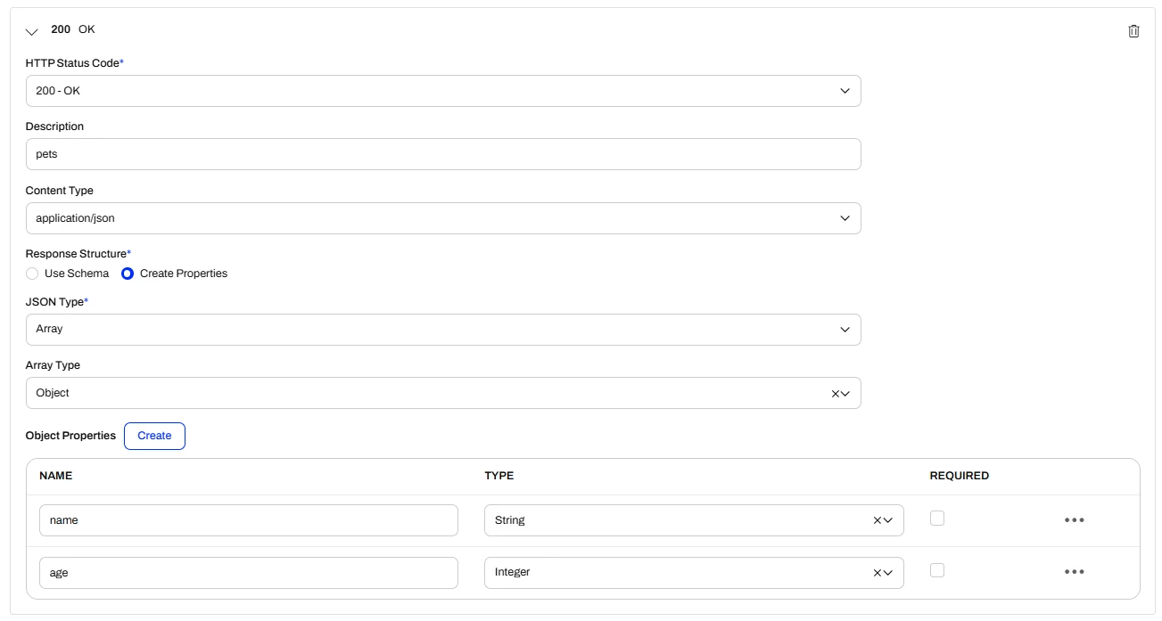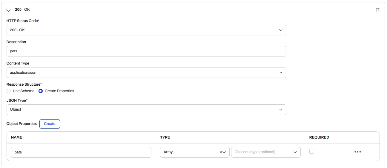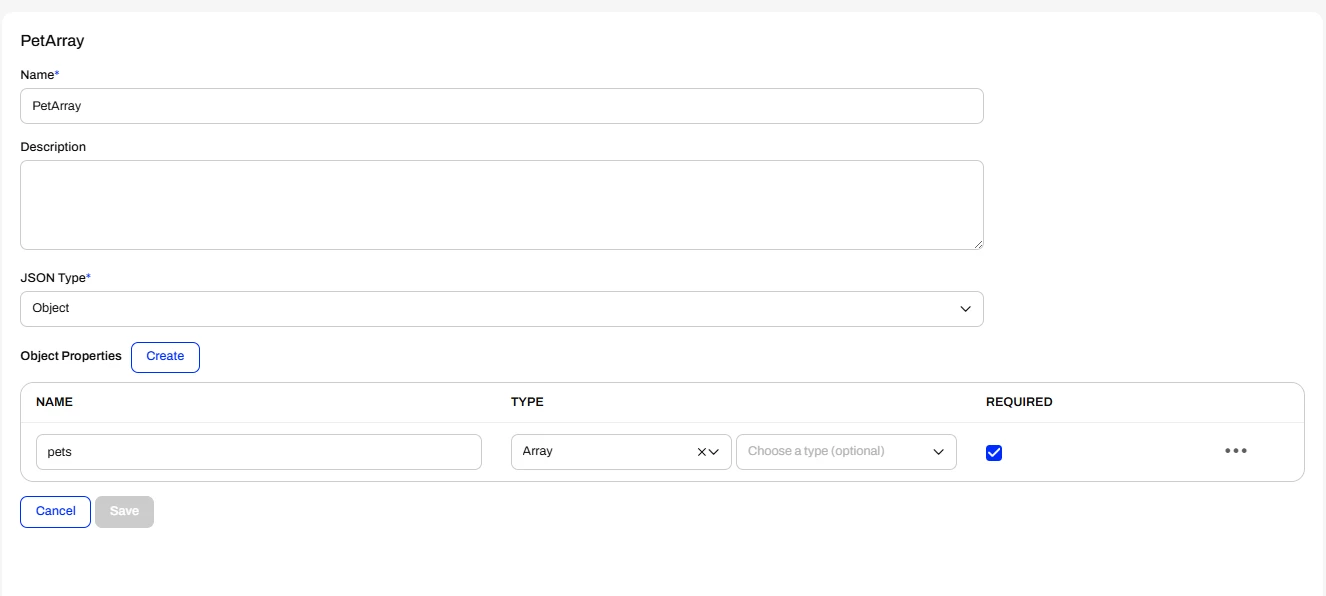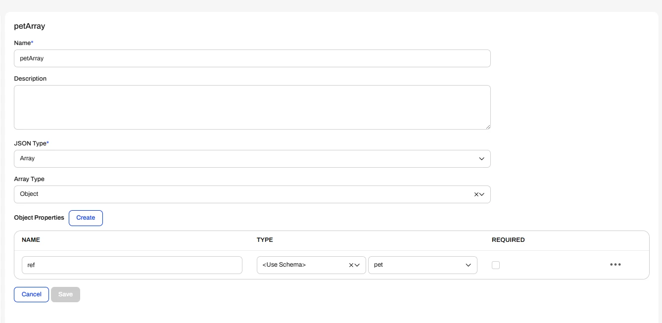 ]If you chose object as the json type for your response you can’t create a property of type array with the array type of pet either as you can’t reference the type of the array to an existing schema. Object arrays are allowed in general but then there would be no documentation of the objects (pet) in it.