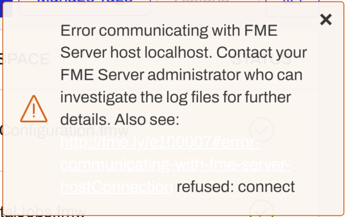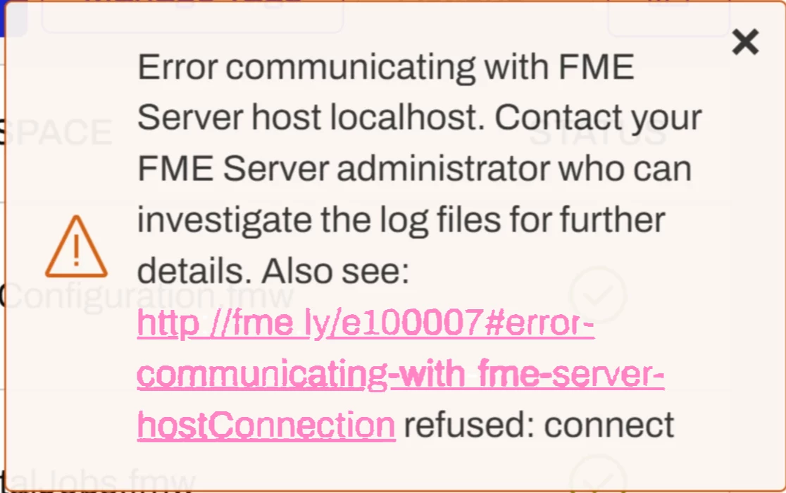 FME Flow gets in this error communicating state and then recovers. We tried restarting FME Flow, it likely made some difference (I am not sure whether it indeed fixed the problem even for a short period of time as FME Flow works between these messages anyway), but it didn’t last.
