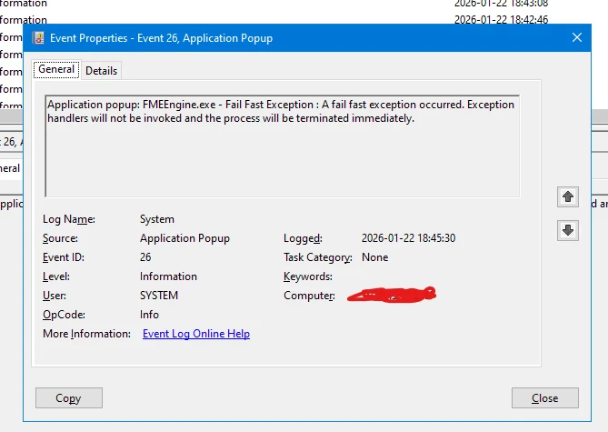 We just upgraded to FME Flow 2025.2.1 and are now seeing some odd errors in our nightly data automation. Two nights in a row we have had jobs stopping at the same spot, there is nothing in the job log, and the job just fails with the message Job did not complete. When I look in the Windows event log (SYSTEM) for the server I can see a note of a “Fail Fast Exception” in fmeengine.exe - has anyone else seen anything like that?