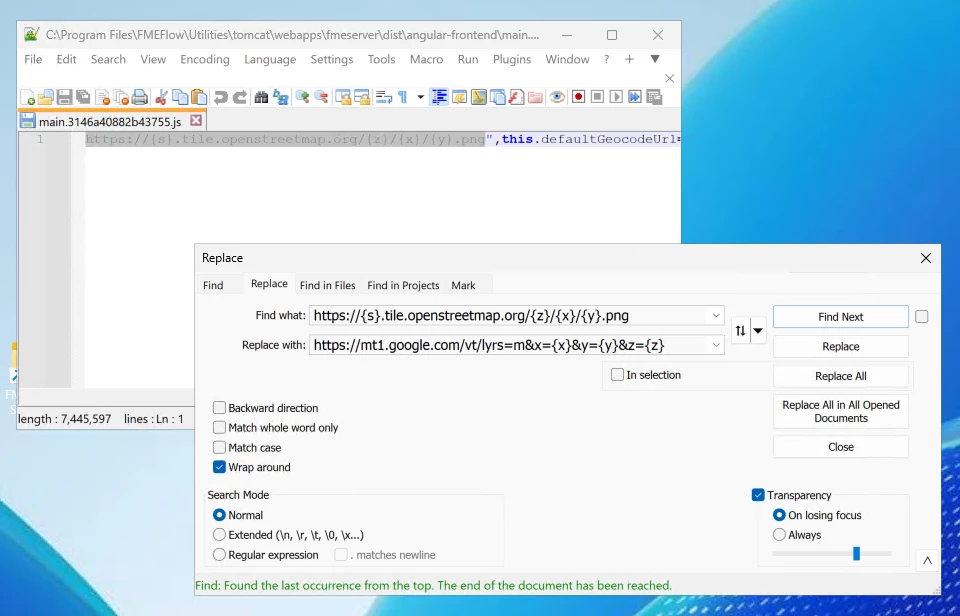 Find a file with name main.*.js. For example, this could be main.643h2jw8830y1jea.js. Open the file with admin permissions to allow editing.