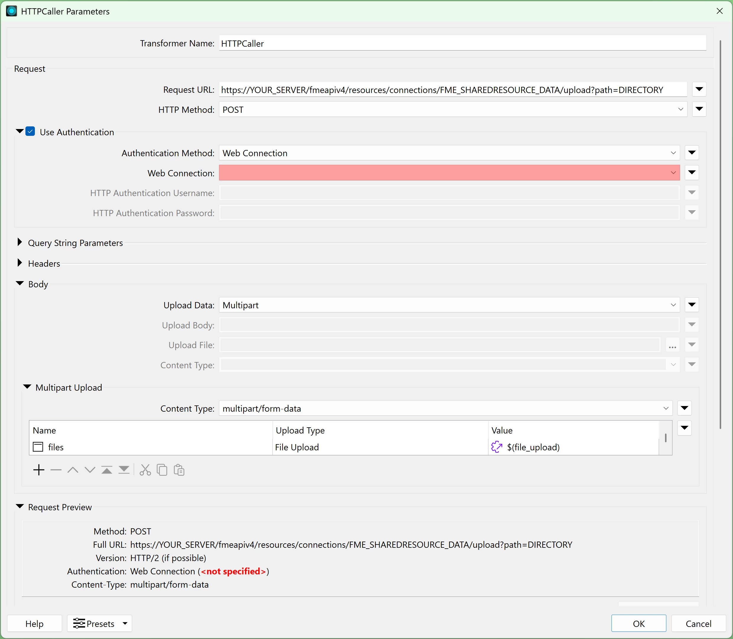 Here I’ve opted to have the user upload to a directory within Resources/Data, but this can be changed by specifying a different connection in the URL. It’s also possible to create a new Resource Connection.