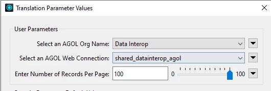 If I parameterize Use case a above, my User parameter dialog would look like below. The top drop down for my HTTPCaller and the bottom one for my ArcGISOnline Connector.
