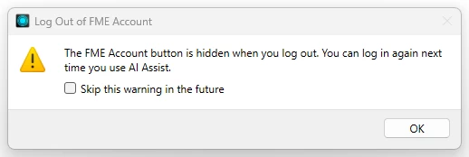 If you click on the log out of FME account menu item, then you see this dialog: