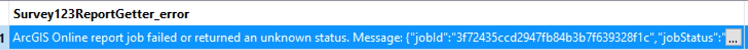I can run the workspace but it’s failing on the Survey123ReportGetter transformer. It’s a general error stating ‘ArcGIS Online report job failed or returned an unknown status’. I can see in Survey123 within ArcGIS Online that the report has indeed kicked off and is generated, but my belief is that it is taking too much time to return that info back to FME so FME says its a failure. Currently in my workbench, that failure is occuring within a minute and I know that the Survey123 report process can take a little bit more time than that.