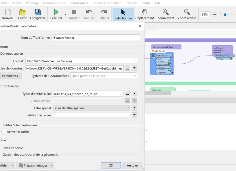 Je souhaite récupérer des données WFS de l’IGN (BD TOPO), mais je n’arrive pas à lire toutes les entités sur FME. Pouvez-vous m’aider à configurer le paramétrage ou me dire s’il est possible de récupérer uniquement les données du département de la Haute-Garonne ?