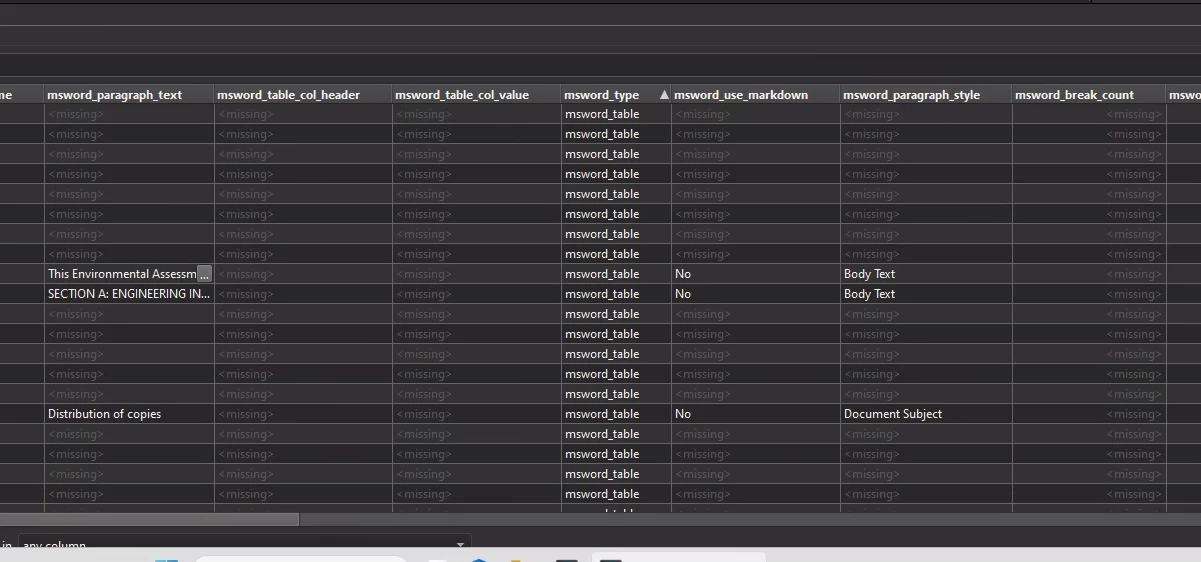 I’m looking to read in a load of word documents that contain tables of information. I’d like to extract all the text from those tables so that I can then search the text for specific information. I’ve tried using the Microsoft Word Reader and the MSWordStyler but I’m only seeing the paragraph text come through to the attributes. Any ideas how to extract the table text?