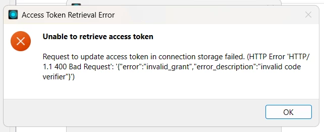 I have been following this article https://support.safe.com/hc/en-us/articles/25407494166029-Connecting-to-Salesforce-in-FME but am getting this error “Request to update access token in connection storage failed. (HTTP Error 'HTTP/1.1 400 Bad Request': '{"error":"invalid_grant","error_description":"invalid code verifier"}')” when I test the connection