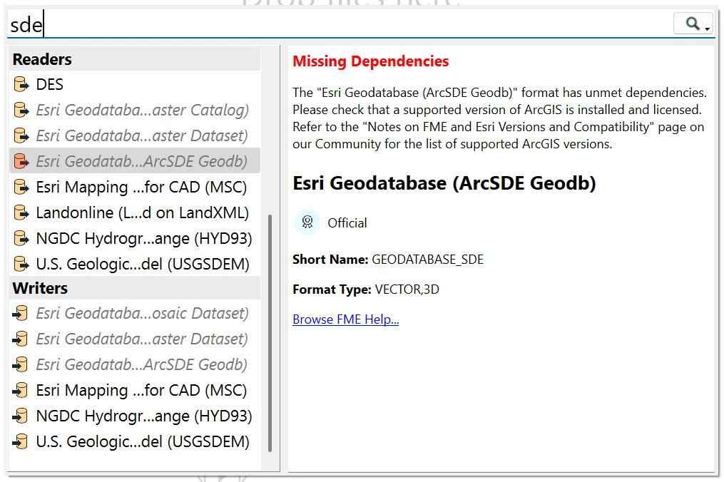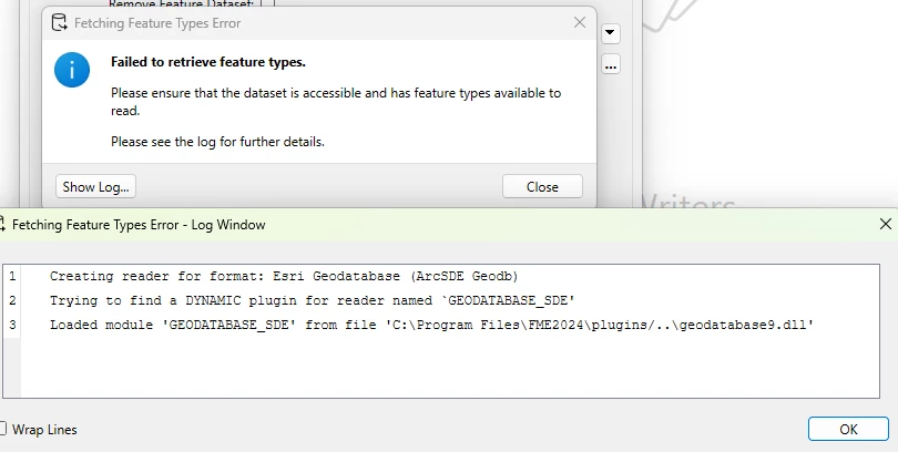 I am using FME workbench 2024.1 to read an SDE database, every ting looks good, but tables can not be loaded. SDE database works in ArcGIS Pro, and the testing data connection in FME are also good. Anyone has experienced the same?