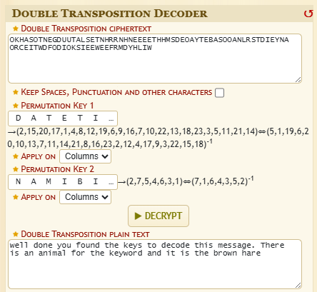 well done you found the keys to decode this message. There is an animal for the keyword and it is the brown hare