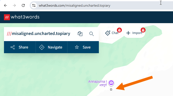 Underlined are the important parts. "What Three Words" is a web service where geographic position is defined by three random words. The three words to search for are "misaligned uncharted topiary".