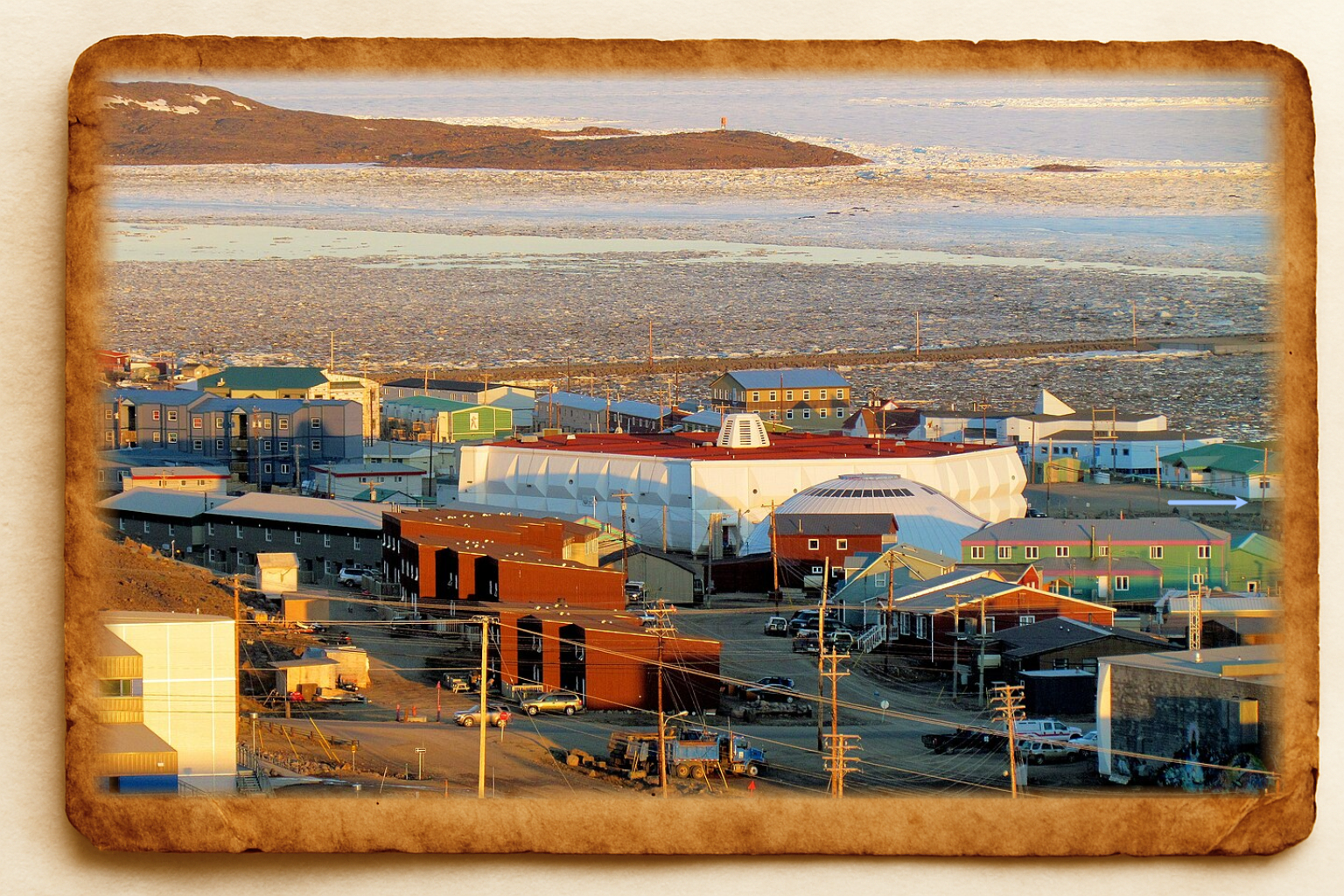 - The final clue is an image. It has an arrow marked on it to identify a specific point. You should already have known the image is of Iqaluit in Nunavut, Canada. This new image just identies the exact point in mind. The arrow is in light blue and hard to spot. Check the building on the right-hand side of the image.