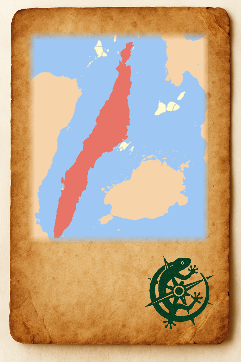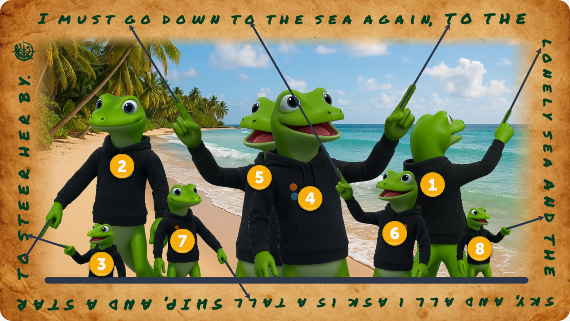 The image shows a lot of lizards pointing to fun things on a beach. There is also a text sentence around the edge of the image.