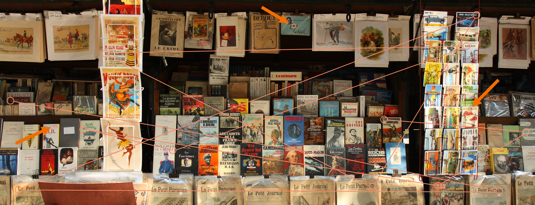 The image is a photograph of a second-hand book seller in Paris. It's likely that the characters to be seen in the image will form the keyword, but there are so many characters that it's hard to tell which ones to use.