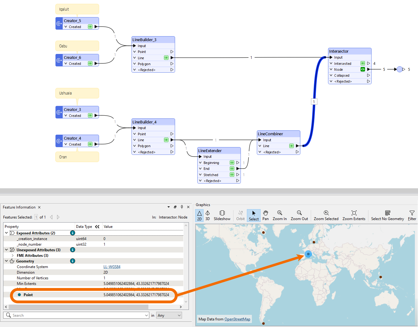 Here's the FME workspace I created to find the intersection point. I threw in a LineCombiner just to visualize the line extension a little better.