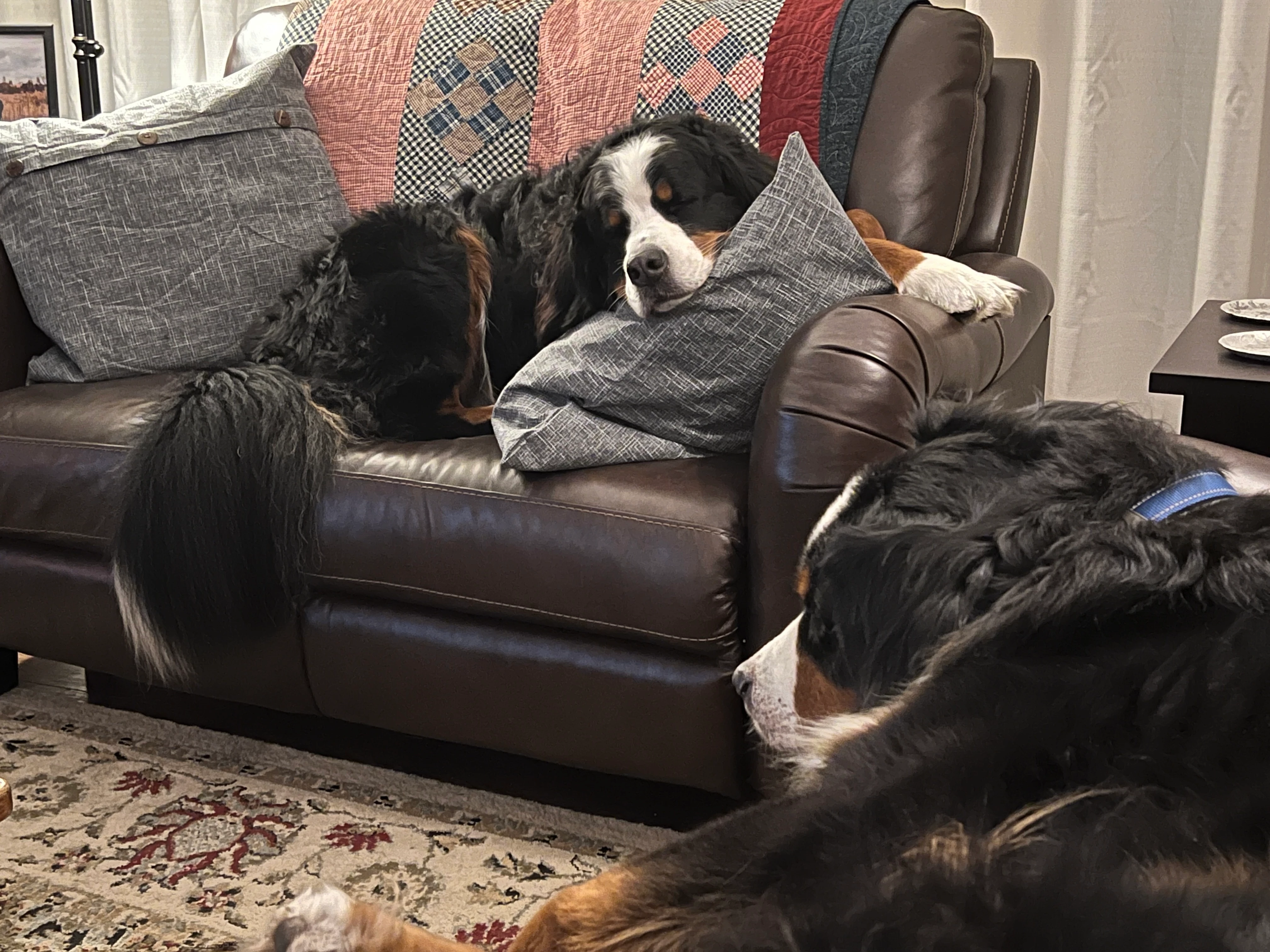 Journeying downstairs to get fluffed by my Bernese Mountain Dogs!