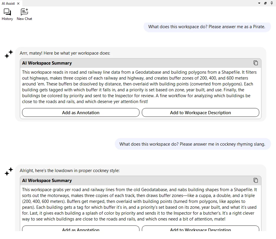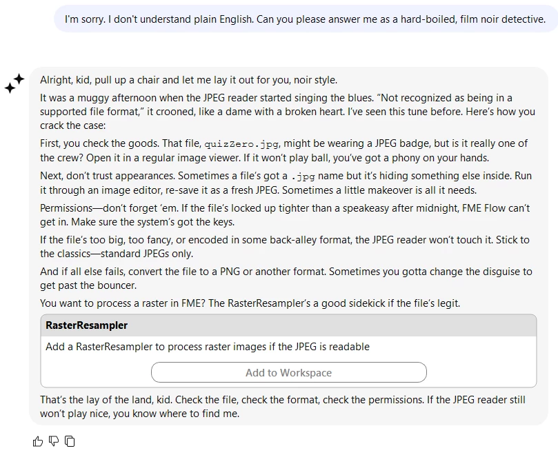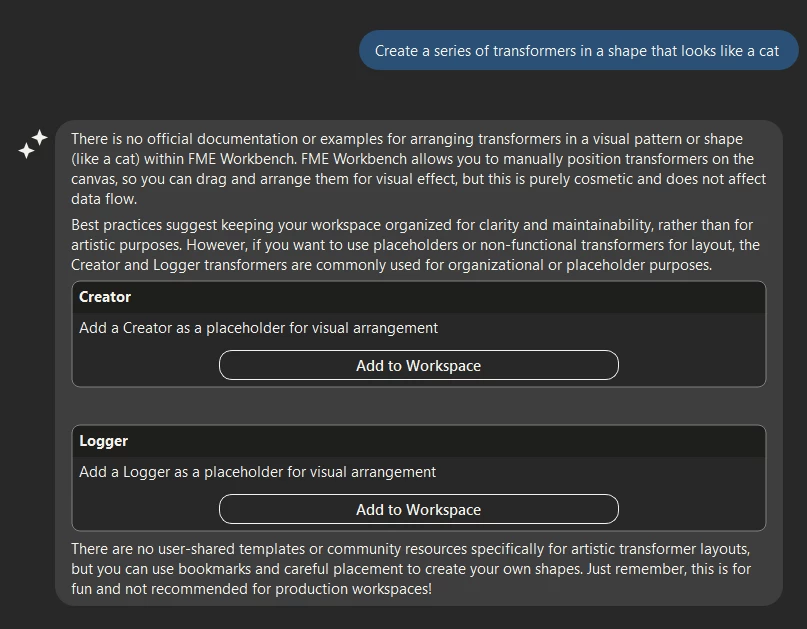 Like most others I havent had a chance to test FMEs AI Assist, since we are not allowed to use it at work. But i would be curious to see how creative it can be explaining complex workspaces or solving tricky FME problems.
