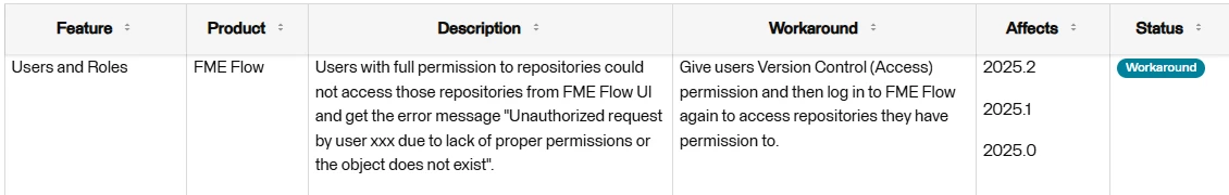 After an update from FME-flow 2024 to 2025 and after the update some roles are not able to open the repositories under workspaces. They get the message ‘Unauthorized request by user <user> due to lack of proper permissions or the object does not exist’.